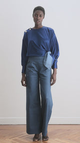 Blusa de corte oversize con manga larga abullonada y escote redondeado. Realizada en un ligero satén color azul tinta, y decorada con tres botones de porcelana estampada hechos a mano en el hombro y los puños. Esta blusa combina con numerosas piezas de la colección de Beatriz de la Cámara para un estilo atemporal.